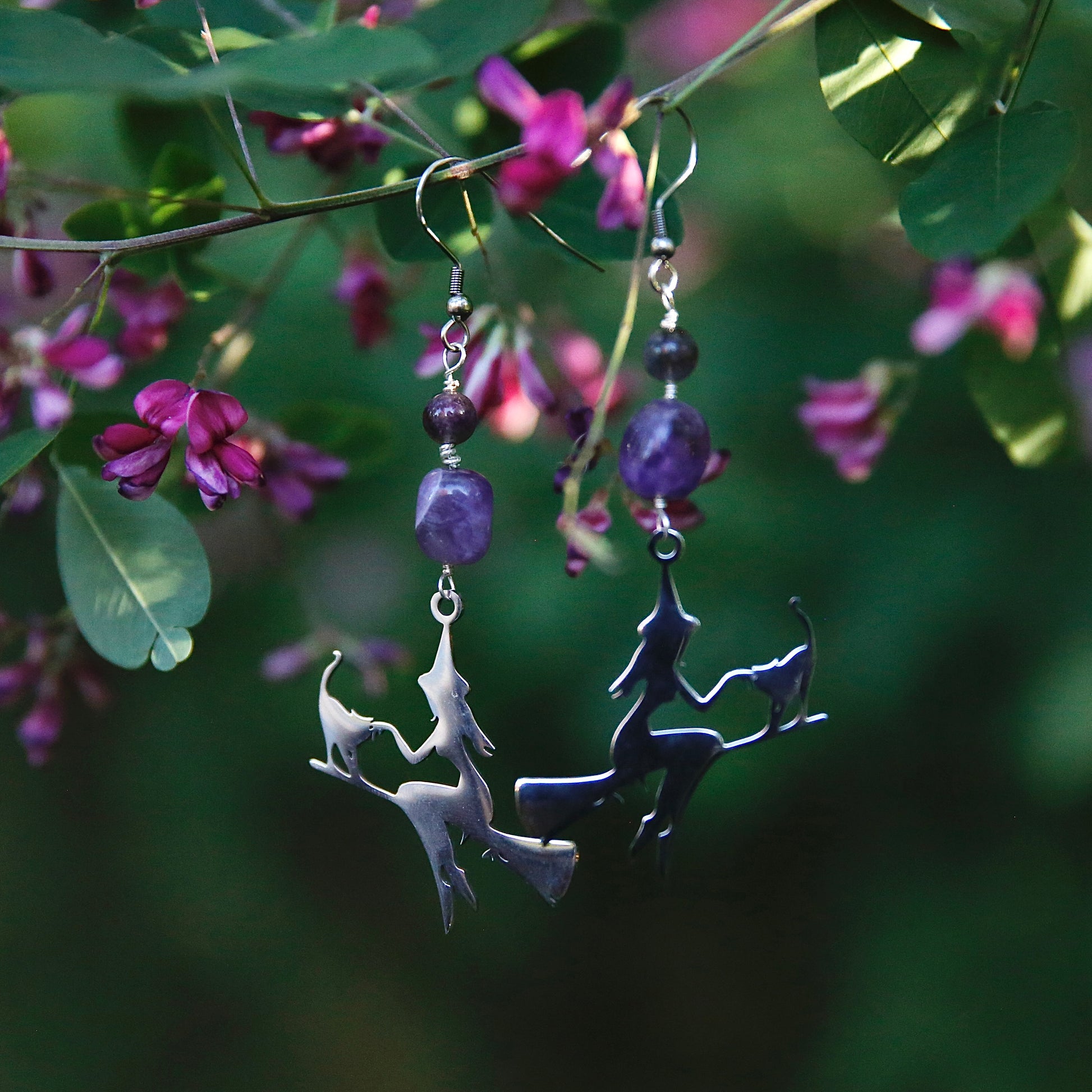 Amethyst earrings with stainless steel witches on stainless steel fish hooks with plastic backings. Earrings are roughly 3 1/4" top to bottom.