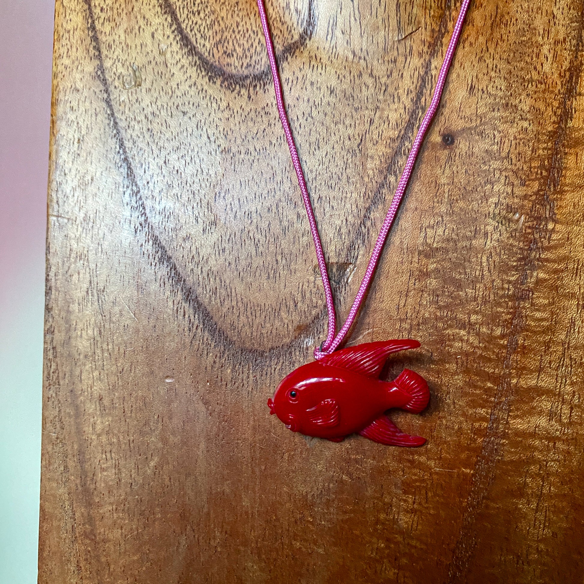 Fish trinket found yard saling with stainless steel hardware on a removable pink nylon adjustable slipknot cord. Maximum overall length is 24", minimum 12".