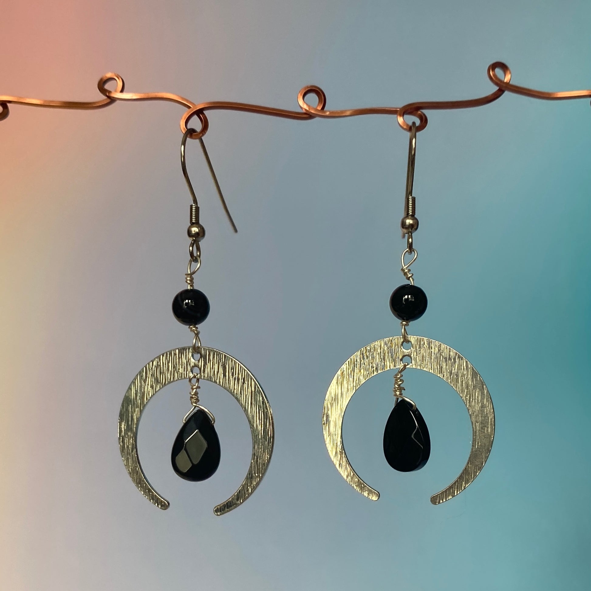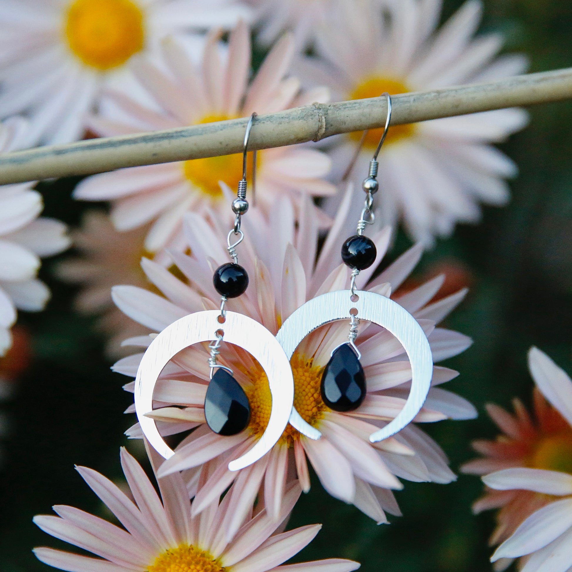 Onyx & jasper earrings with stainless steel moons on stainless steel fish hooks with plastic backings. Earrings are roughly 2 1/2" top to bottom.